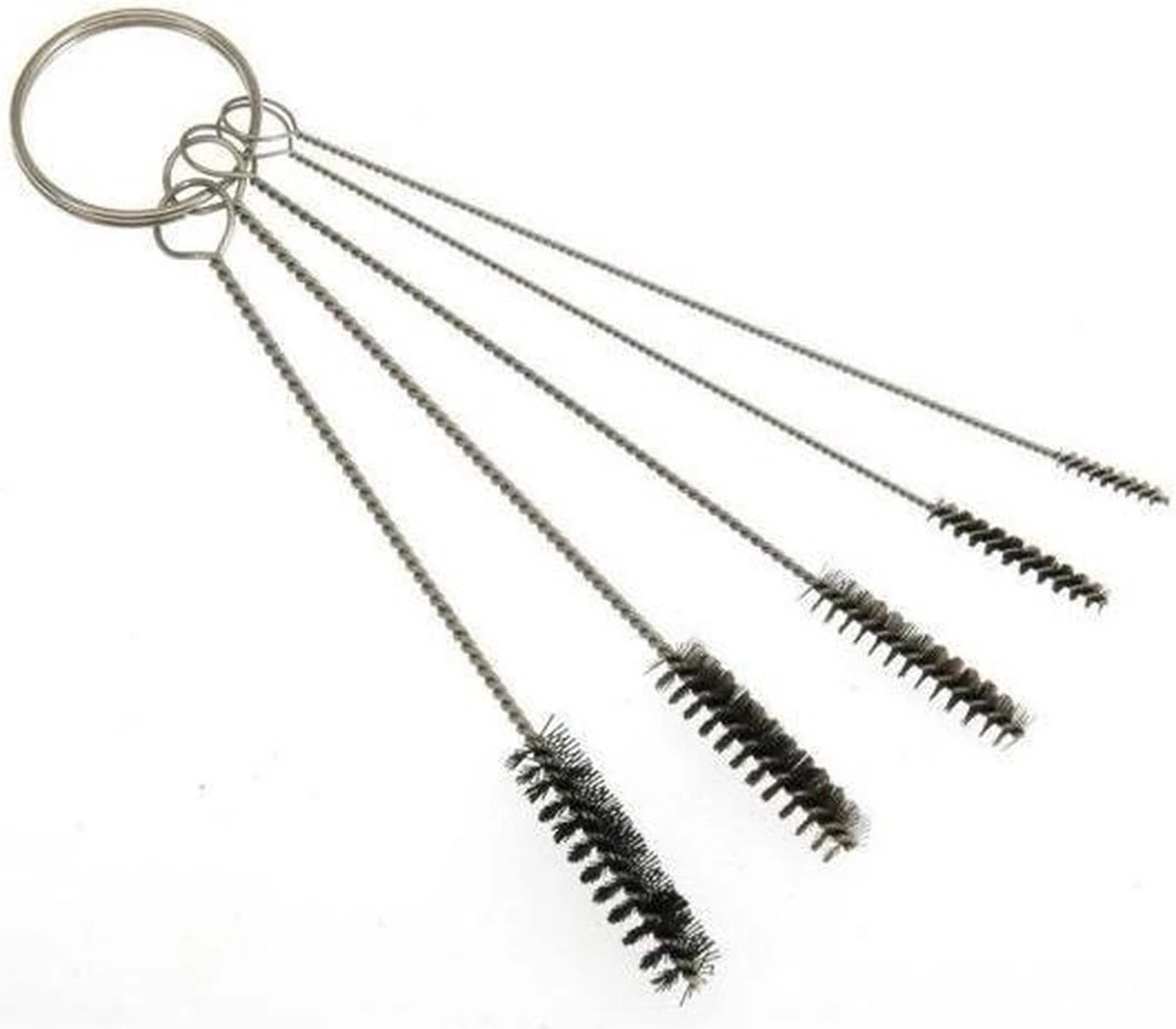 Borstel / rager reinigingsset staal 5 delig. Set van 5 stuks kleine stalen ragers in verschillende formaten. De ragers worden bij elkaar gehouden door een sleutelhanger, waardoor zie niet rondslingeren. Handig hulpmiddel voor reiniging in hoekjes en gaatjes. Materiaal borstels: nylon. Lengte: 10cm. Diameter borsteltjes: 2mm, 3mm, 5mm, 6mm en 7mm.